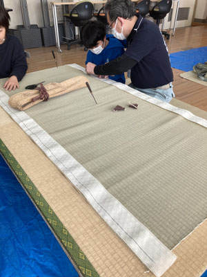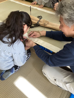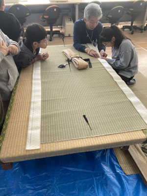 ゴザの手縫い体験では、針が思うところに出てこないことで何度も刺し直しながら縫っていました。