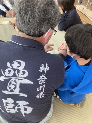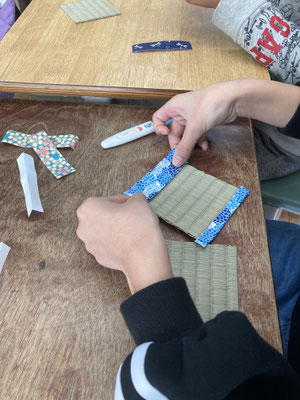 ①畳のコースター作り、②畳の敷き方実習、③ゴザの手縫い体験をしてもらい。